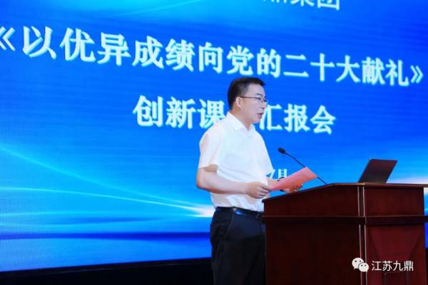 今年,九鼎集團組織實施42項創新課題作為向黨的二十大獻禮的實際行動。這些課題包括新產品開發、裝備技術轉型升級、管理水平提升等方面,目標在今年內全部完成課題任務,成為企業高質量發展強力支撐。為了提振信心、鼓舞士氣、堅定完成課題目標的決心,7月14日,集團召開“以優異成績向黨的二十獻禮”創新課題匯報會,從42項課題中遴選11項重點課題進行匯報。中共如皋市委書記何益軍、市委辦公室主任吳小平、市科創辦黨組副書記叢明昌、市發改委黨組成員徐亞峰、高新區黨工委委員周小芳,以及市級機關和高新區相關部門負責同志參加了匯報會。匯報會由集團副董事長顧柔堅主持。